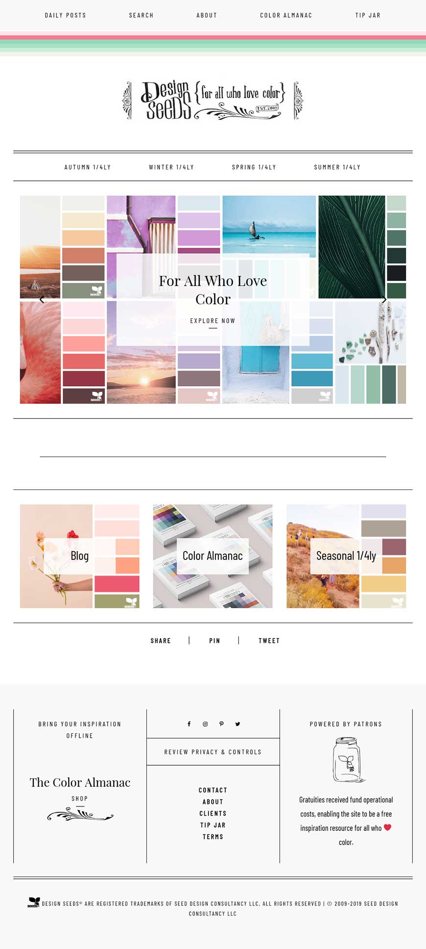 Design Seeds 是一个以春、夏、秋、冬四季作为配色分类的网站,配色清新清爽。除了四季分类,也有每日配色推荐。(国外网站|可直接访问)