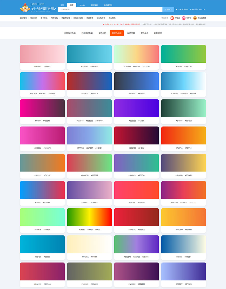 该网站中包含有超过200+的渐变配色方案,并且支持按颜色查找。(国外网站|可直接访问)