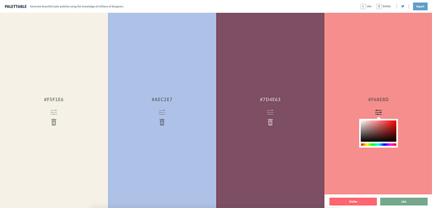 Palettable 会为你随机推荐一种颜色,你只需要选择喜欢或是不喜欢即可,后会匹配出一组多5种颜色的色卡,匹配出来的颜色也可以自由更改。(国外网站|可直接访问)