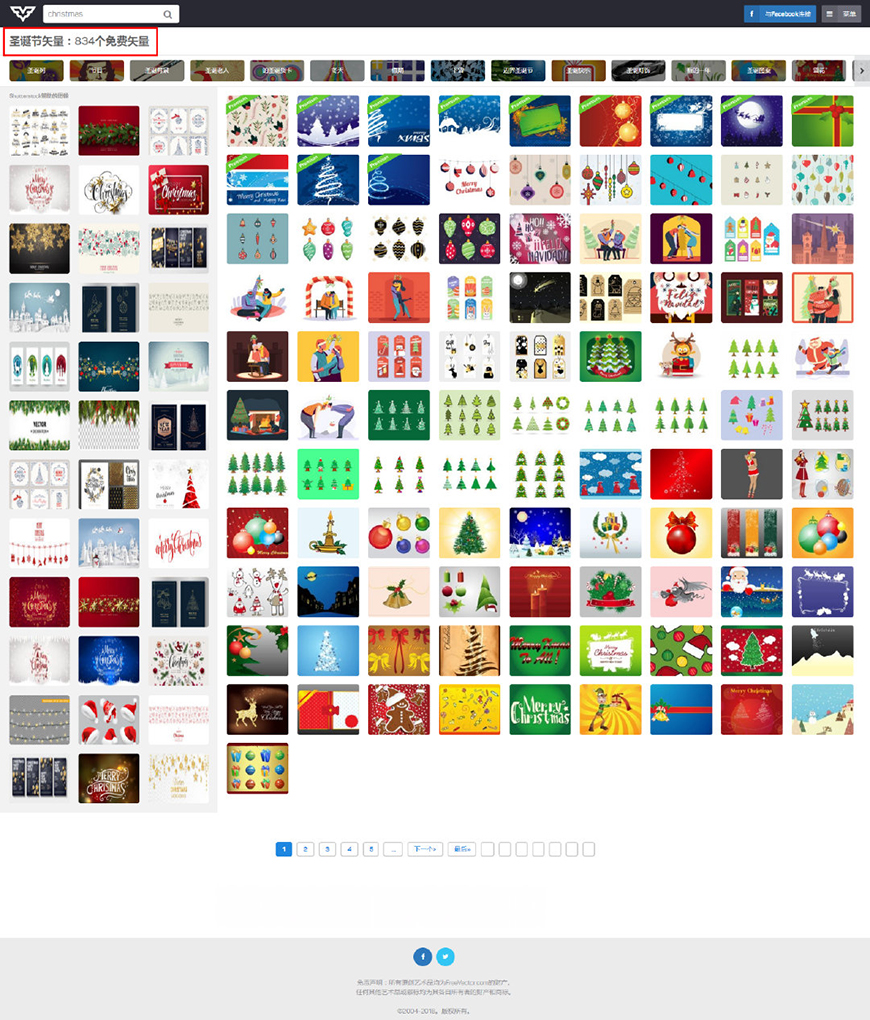 小伙伴们注意一下左上角,网站还给统计了一共有834个免费圣诞节矢量素材。贴上绿色布条的,是需要付费才能下载的,但仅仅是极少数。